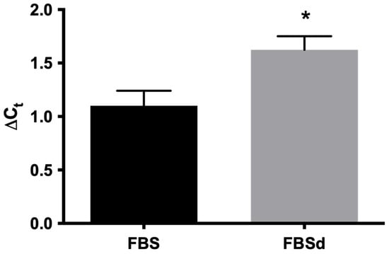 Expression of subtilisin mRNA in L. amazonensis in the presence of FBS and FBSd. L. amazonensis promastigotes were cultivated in RPMI medium containing 10% FSB or FSBd for 72 h. The expression of subtilisin mRNA was evaluated by real-time PCR. The expression of the glyceraldehyde 3-phosphate dehydrogenase (GAPDH) gene was used to normalize the data. The experiments were performed in triplicate and repeated three times. * p < 0.05.