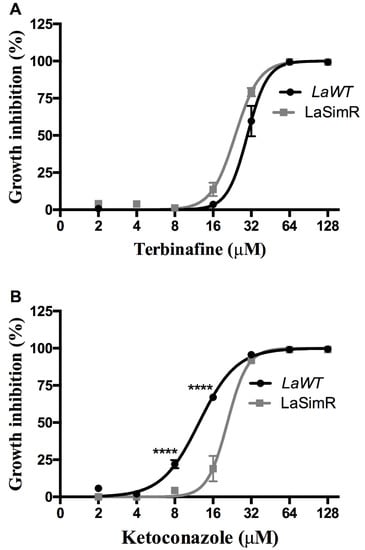 Leishmanicidal activity of terbinafine and ketoconazole in the wild-type and simvastatin-resistant strains of L. amazonensis. Wild-type (LaWT) and simvastatin-resistant (LaSimR) promastigotes were incubated at an initial concentration of 1 × 106 promastigotes/mL in the presence of indicated concentrations of terbinafine (0–128 μM) or ketoconazole (0–128 μM) for 72 h at 26 °C. After incubation, the growth was evaluated using resazurin (alamarBlue®); after 4 h, the reaction was evaluated by fluorimetry (excitation at 560 nm and emission at 590 nm). (A) Terbinafine and (B) ketoconazole. The experiments were performed in triplicate and repeated three times. **** p < 0.0001.