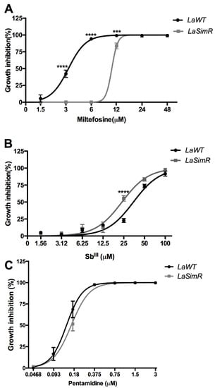 Leishmanicidal activity of antileishmanial drugs against wild-type and simvastatin-resistant strains of L. amazonensis. Wild-type (LaWT) and simvastatin-resistant (LaSimR) promastigotes were incubated at an initial concentration of 1 × 106 promastigotes/mL in the presence of indicated concentrations of miltefosine (0–48 μM), trivalent antimony SbIII (0–100 μM), or pentamidine (0–3 μM) for 72 h at 26 °C. After incubation, the growth was evaluated using resazurin (alamarBlue®); after 4 h, the reaction was evaluated by fluorimetry (excitation at 560 nm and emission at 590 nm). (A) Miltefosine, (B) SbIII, and (C) pentamidine. The experiments were performed in triplicate and repeated three times. *** p < 0.001; **** p < 0.0001.
