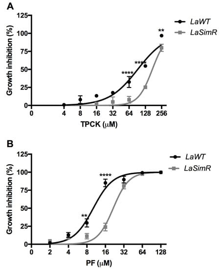 Leishmanicidal activity of serine protease inhibitors against wild-type and simvastatin-resistant strains of L. amazonensis. Wild-type (LaWT) and simvastatin-resistant (LaSimR) promastigotes were incubated at an initial concentration of 1 × 106 promastigotes/mL in the presence of indicated concentrations of N-p-tosyl-L-phenylalanine chloromethyl ketone (TPCK) (0–256 μM) or PF-429242 (PF) (0–128 μM) for 72 h at 26 °C. After incubation, the growth was evaluated using resazurin (alamarBlue®); after 4 h, the reaction was evaluated by fluorimetry (excitation at 560 nm and emission at 590 nm). (A) TPCK (B) PF. The experiments were performed in triplicate and repeated three times. ** p < 0.01, **** p < 0.0001.
