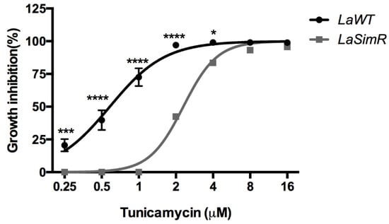 Tunicamycin is an antibiotic that inhibits N-acetylglucosamine transferases and was used to induce the activation of another pathway dependent on S1P in mammalian cells [38].To assess whether an increase in the expression of subtilisin in the LaSimR strain interferes with tunicamycin activity, we treated the LaSimR and LaWT strains with tunicamycin. The LaSimR strain was cross-resistant to tunicamycin, with an EC50 of 2.29 μM (95% CI: 2.16–2.43 μM), whereas the LaWT strain was more sensitive to this inhibitor, with an EC50 of 0.58 μM (95% CI: 0.51–0.65 μM) (Figure 7 and Table 2).