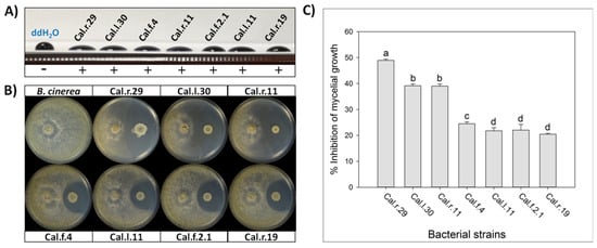 As presented in a previous study of ours, a total number of 119 cultivable endophytic bacterial strains were isolated from different plant parts such as roots, leaves and flowers of the medicinal plant Calendula officinalis, from which twenty-four morphologically distinct endophytic bacterial strains of the genus Bacillus were identified based on 16S rRNA sequencing analysis []. After co-cultivation with Arabidopsis thaliana seedlings, the majority of Bacillus strains positively affected plants’ morphological characteristics such as total fresh weight, primary root length, lateral root number and root hair number []. In the current study, the most promising Bacillus isolates, B. halotolerans strains Cal.l.30, Cal.f.4, Cal.l.11, Cal.f.2.1, Cal.r.11, B. velezensis strain Cal.r.29 and B. subtilis strain Cal.r.19, were further selected and studied for their possible antifungal activity. Among them, Bacillus velezensis Cal.r.29, B. halotolerans Cal.l.30 and B. halotolerans Cal.r.11 prevented B. cinerea more efficiently by creating the strongest inhibition zone in between, under in vitro dual culture assay. Bacteria of the genus Bacillus stand out for their antagonistic activity due to their multiple antimicrobial secondary metabolites and modes of action, with secreted lipopeptides being the most crucial [,]. Previous studies have shown that the inhibition zone created during the microbial interaction consists of lytic enzymes and accumulated secreted antimicrobial compounds with biosurfactants, mainly lipopeptides, being mostly responsible for phytopathogen suppression []. The secretion of biosurfactants takes place not only on solid and semi-solid substrates, but also on liquid growth medium, maintaining their strong antimicrobial activity []. Biosurfactants are molecules that play an important role in antagonistic attributes of microbial BCAs because they facilitate colonization, they may have direct antimicrobial properties or elicit an immune response in plant tissues that makes the host less susceptible to subsequent infection []. In the present study, all seven Bacillus strains that created a strong inhibition zone against B. cinerea, were also positive for secreting biosurfactants into their liquid culture with their supernatant showing excellent drop collapse ability.