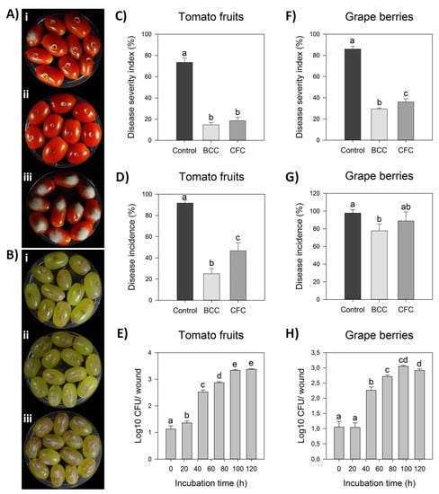 However, treatment with BCC (liquid bacterial cell culture) containing both living bacterial cells and multiple secreted secondary metabolites/ biosurfactants was more efficient than CFC in suppressing gray mold in both fruits studied. Specifically, BCC treatment on tomato fruit significantly reduced disease incidence by 14.63% in comparison to CFC inoculation (18.52%) and the negative control (73.52%), whereas disease severity index was equally reduced after both BCC and CFC formulations (Figure 2A,B). As described in Figure 2G, infected grape berries were significantly reduced in both treatments, with disease incidence being 77.78% and 88.89% after BCC and CFC inoculation, respectively, in comparison to the control treatment (97.78%). In addition, disease severity index was also significantly reduced in both BCC and CFC treatments by 28.89% and 33.33%, respectively, in comparison to the control treatment (85.93%) (Figure 2F).