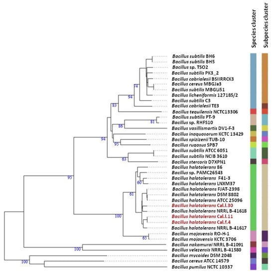Whole genome phylogenomic tree of Bacillus strains closely related to B. halotolerans strains Cal.l.30, Cal.f.4 and Cal.l.11, constructed using the type (strain) genome server—TYGS. The numbers at the branches are pseudo-bootstrap support values inferred from 100 replicates. The two colored columns to the right of each name refer to the genome-based species and subspecies clusters, respectively, as determined by dDDH cut-off of 70 and 79%, respectively. B. halotolerans strains Cal.l.30, Cal.l.11 and Cal.f.4 are highlighted in red.