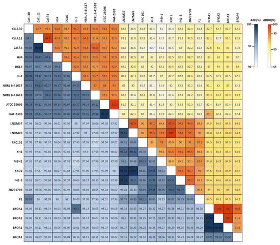 Heatmap of Average Nucleotide Identity (ANI) and digital DNA–DNA Hybridization (dDDH) scores among B. halotolerans strains.
