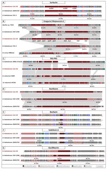 AntiSMASH genome mining for SM-BGCs revealed that B. halotolerans Cal.l.30 harbors 10 BGCs, indicating that a large proportion (12.56%) of its genome is dedicated for the biosynthesis of secondary metabolites (Table 1 and Figure 5A–G). Among the predicted BGCs, four NRPS clusters, associated with the synthesis of surfactin, fengycin, bacillaene and bacillibactin, one RiPP cluster, one subtilosin A and one bacilysin gene cluster, were detected (Table 1). BGC of mojavensin A was not present as an individual cluster but was detected adjacent to the fengycin gene cluster. The remaining BGCs, including this of kalimantacin A (bearing only 20% resemblance to the BGC encoding kalimantacin A), appear to be involved in the biosynthesis of metabolites of unknown function.