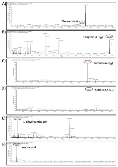 One of the most important observations in our study was the ability of Cal.l.30 to secrete the iturinic-type lipopeptide mojavensin A. Metabolic analysis of Cal.l.30, confirmed the results of genomic analysis corresponding to the lipopeptide of mojavensin A (C50H77N13O14), with an m/z value of 1082.5617. This result is in agreement with Ma and colleagues who first isolated and identified mojavensin A in B. mojavensis B0621A [].