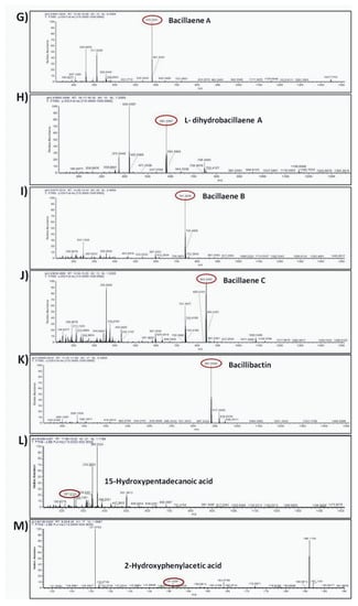Agar-diffusible secondary metabolites secreted by B. halotolerans Cal.l.30 and annotated through UHPLC-HRMS analysis. The compounds were putatively annotated based on isotope distribution and the accurate mass (±5 ppm). The precise masses revealed the presence of compounds (A) mojavensin A, (B) fengycin A, (C) Surfactin A C13, (D) Surfactin A C15, (E) L-dihydroanticapsin (K) bacillibactin, (G–J) four analogues of bacillaene, known as bacillaene A, dihydrobacillaene, bacillaene B and bacillaene C, respectively, (F,L,M) azelaic acid, 15-hydroxypentadecanoid acid and 2-hydroxyphenylacetic acid, respectively.