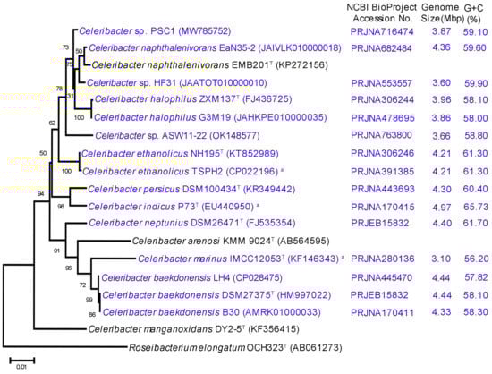 Phylogenetic tree based on 16S rRNA gene sequences showing the relationship between strain PS-C1 and representatives of Celeribacter spp. [19,20,21,22,23,24,25,26,27,28,29,30,31,32]. The 16S rRNA NCBI GenBank accession number for each strain is shown in brackets. The 16S rRNA sequences were aligned using ClustalW, and the tree was constructed using a neighbour-joining method with 1000 bootstrap replicates embedded in the MEGA11 software package [45]. The sequenced genomes and their respective information are indicated in blue. The scale bar represents 0.01 nucleotide substitution per site. Roseibacterium elongatum OCH323T was used as an out-group. T Type strain; a complete genome.