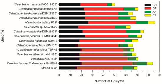 Total number of CAZymes present in strain PS-C1 and 14 other known genomes of Celeribacter spp. GH: glycoside hydrolase; GT: glycoside transferase; AA: auxiliary activity; CE: carbohydrate esterase; a complete genome; T type strain.