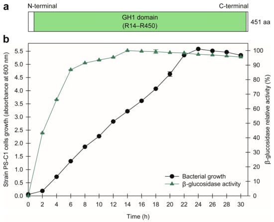 We then expressed and elucidated the activities of two GHs (BglPS-C1 and LicPS-C1) in strain PS-C1. For BglPS-C1, the protein sequence (451 residues) consisted of a GH1 domain located at position R14–R450, as predicted using the InterProScan server (Figure 4a).