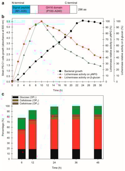 In addition, the LicPS-C1 protein sequence (296 residues) is composed of a signal peptide (M1–A35) and a GH16 domain (P100–A240), which act as the extracellular secretion signal [73] and catalytic region [74], respectively (Figure 5a).