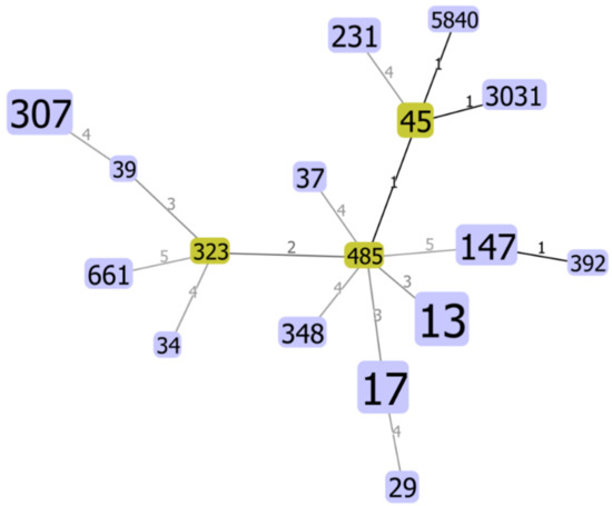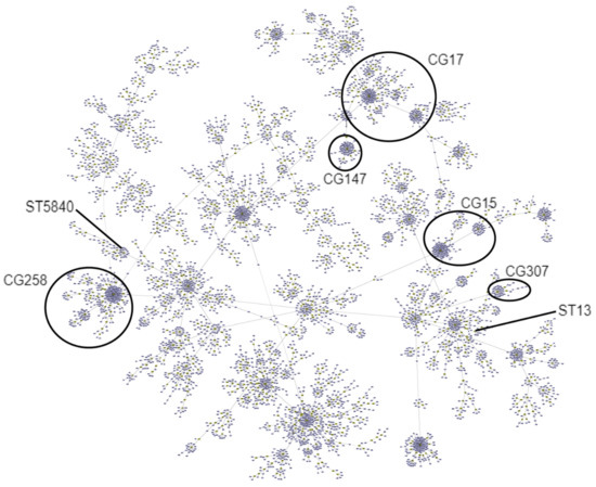 Phylogenetic tree of all worldwide K. pneumoniae allelic profiles available at the Pasteur MLST website. The MLST data used in the construction of the minimum-spanning tree was retrieved through the downloadable scheme MLST profiles of K. pneumoniae available at the Pasteur MLST website (http://www.pasteur.fr/mlst; accessed on 6 October 2021). Phylogenetic reconstruction was generated by goeBURST Full MST on PHYLOViZ V2.0 and the most common ST found (ST13, ST17, ST147, ST307, and the novel ST5840) are identified. ST17 belongs to CG17, ST147 to CG147, and ST307 to CG307. ST13 and ST5840 do not belong to any of the CGs showed in this phylogenetic tree.