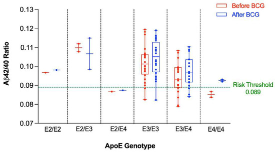 Aβ42/40 ratio before and after BCG vaccination stratified by ApoE genotype. An Aβ42/40 ratio below 0.089 is associated with higher risk of positive amyloid PET scan.