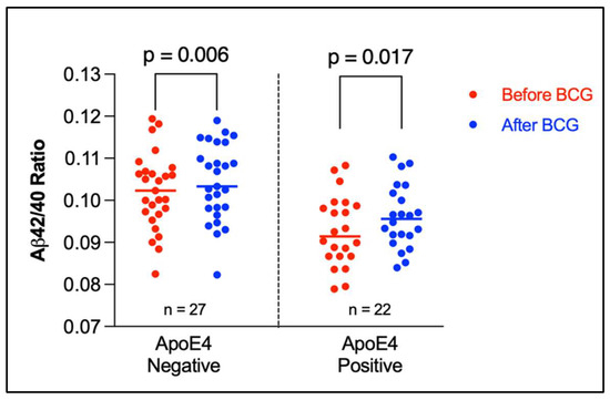 The Aβ42/40 ratio for each participant was stratified by ApoE genotype (Figure 1). As can be seen, participants having at least one ApoE4 allele tended to have lower Aβ42/40 ratio compared to participants having other alleles. Figure 2 depicts a dot plot for individual values of amyloid 42/40 ratio in participants stratified by ApoE genotype. The figure shows that participants tended to have higher values of Aβ42/Aβ40 ratio after BCG vaccine administration compared to the baseline ratio before BCG vaccine administration regardless of ApoE4 allele status.