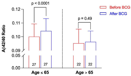 Aβ42/40 ratio before and after BCG vaccination stratified by age group. Data are presented as mean ± SD. The numbers inside the bars represent the number of observations. Statistical analysis was completed using a paired t-test.