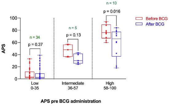 The change in APS following BCG vaccination in the participants was stratified by the risk of positive PET scan as assessed by the baseline APS. The APS was reduced after BCG administration in the three risk categories (Figure 4). However, such a reduction reached statistical significance only in the high-risk category (p = 0.016) (Figure 4).