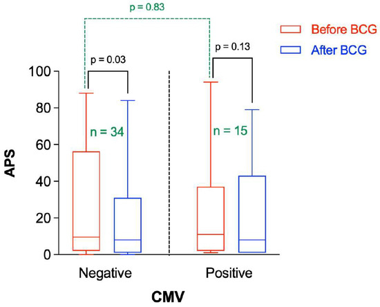 Thus, the change in APS following BCG vaccination was stratified by the CMV IgG status. There was no significant difference in APS before BCG administration between participants having negative or positive CMV IgG (Figure 5). However, the APS was significantly reduced after BCG vaccination in participants having negative CMV IgG (p = 0.03), whereas there was no significant change in the APS following BCG vaccination in participants with positive CMV IgG (p = 0.13).