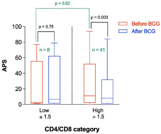 There is a marked decrease in naïve CD4 subsets in patients with AD consistent with the immune system challenged by immunosenescence and/or persistent antigenic challenge [16]. The APS before and after BCG vaccination were stratified by the relative CD4/CD8 ratio (Figure 6). As can be seen, there was no significant difference in APS values before BCG vaccine administration between participants having low or high CD4/CD8 ratio (p = 0.52). On average, the APS was significantly lower after BCG administration in participants having a higher CD4/CD8 ratio (p = 0.003), whereas it was not significantly different in participants with a lower CD4/CD8 ratio (p = 0.75) (Figure 6).