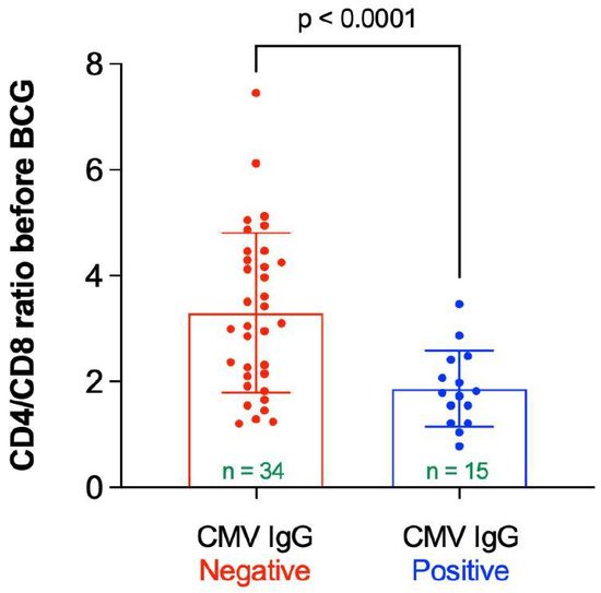 In elderly individuals positive for CMV there is paucity of naïve T-cells and an accumulation of terminal T-cells with no proliferative capacity [17]. This “immune risk profile” manifests in an inverted CD4:CD8 ratio [17,18]. Thus, the mean CD4/CD8 ratio was measured as a function of the CMV IgG status. As can be seen in Figure 7, the mean CD4/CD8 ratio before vaccine administration was significantly higher in participants having negative CMV IgG compared to participants having positive CMV IgG (mean ± SD = 3.30 ± 1.51 vs. 1.87 ± 0.19, p < 0.0001). The mean CD4/CD8 ratio was not significantly altered in participants following BCG vaccine administration compared to the baseline value (2.86 ± 1.47 vs. 2.84 ± 1.47, p = 0.716).