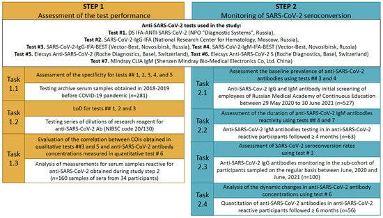 Kichatova, V.S.; Asadi Mobarkhan, F.A.; Potemkin, I.A.; Zlobin, S.P.; Perfilieva, O.M.; Valuev-Elliston, V.T.; Ivanov, A.V.; Solonin, S.A.; Godkov, M.A.; Belikova, M.G.; et al. Assessment of Diagnostic Specificity of Anti-SARS-CoV-2 Antibody Tests and Their Application for Monitoring of Seroconversion and Stability of Antiviral Antibody Response in Healthcare Workers in Moscow. Microorganisms 2022, 10, 429. https://doi.org/10.3390/microorganisms10020429