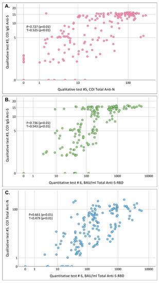 3.2. Correlation of COIs Obtained in Qualitative #3 (SARS-CoV-2-IgG-IFA-BEST) and #5 (Elecsys Anti-SARS-CoV-2) Tests and Anti-SARS-CoV-2 Antibody Concentrations in Quantitative # 6 (Elecsys Anti-SARS-CoV-2 S) Test