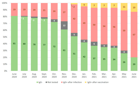- Kasztelewicz, B.; Janiszewska, K.; Burzyńska, J.; Szydłowska, E.; Migdał, M.; Dzierżanowska-Fangrat, K. Prevalence of IgG Antibodies against SARS-CoV-2 among Healthcare Workers in a Tertiary Pediatric Hospital in Poland. PLoS ONE 2021, 16, e0249550. [Google Scholar] [CrossRef]