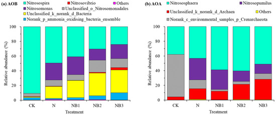 The diversity indices of AOB and AOA calculated from 16S rRNA gene amplicon sequencing are shown in Table 3. The N treatment increased the OTUs of AOB by 44.78% in comparison with the CK treatment. Compared with the N treatment, the NB1, NB2 and NB3 treatments decreased the OTUs of AOB by 3.09%, 5.16% and 9.28%, respectively. A decreasing trend was also observed for AOA under biochar addition. The Chao1 representing the community richness varied among different treatments and between AOB and AOA. N fertilization and biochar addition significantly increased the Chao1 index of AOB, and the NB3 treatment had the highest Chao1 index of 33.67. Nevertheless, no obvious difference was observed for the Chao1 index of AOA. The average ratios of OTUs/Chao1 were 95.42 ± 6.92% and 90.00 ± 6.37% for AOB and AOA, implying that the sequencing efforts for AOB were more exhaustive than those for AOA. Shannon and Simpson, the community diversity indices, showed clear responses to biochar addition for AOB. In comparison with the N treatment, NB1, NB2 and NB3 treatments increased the Shannon index but decreased the Simpson index of AOB. However, the Shannon and Simpson indices of AOA exhibited opposite responses to biochar addition. The coverage index was not responsive to N fertilization or biochar addition for either AOB or AOA.