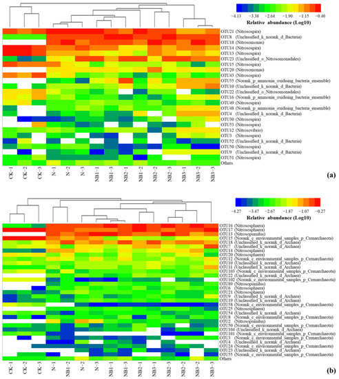The relative abundance of the AOA community at the genus level is shown in Figure 1b. The predominant taxa were Nitrososphaera (50.22 ± 11.27%), Norank_c_environmental_samples_p_Crenarchaeota (16.77 ± 21.49%), Nitrosopumilus (16.69 ± 13.88%) and Unclassified_k_norank_d_Archaea (15.78 ± 9.64%). The genus Nitrosopumilus was barely observed under the CK treatment. The N fertilization significantly enhanced the percentage of Nitrosopumilus and Unclassified_k_norank_d_Archaea, and decreased that of Norank_c_environmental_samples_p_Crenarchaeota. The further application of biochar, by contrast, decreased the relative abundance of Nitrosopumilus and Norank_c_environmental_samples_p_Crenarchaeota, whereas increased that of Nitrososphaera and Unclassified_k_norank_d_Archaea. Figure 2 presents the AOB and AOA community heatmap showing the frequency distribution of the dominant genera as well as the cluster structure.