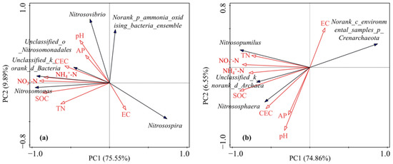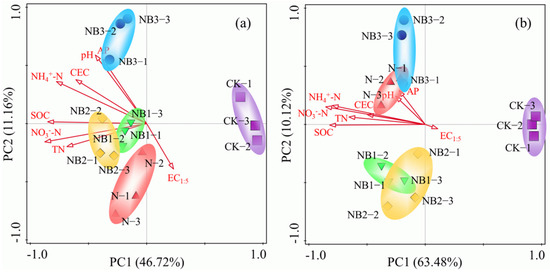 Principal coordinates analysis (PCoA) was used to evaluate the dissimilarity of the AOA and AOB communities. The obtained unconstrained ordination of the AOB and AOA communities and basic soil properties demonstrated that all treatments were clearly separated according to management practices (Figure 3). The first two PCs explained 57.88% of the variability in the AOB community and 73.60% of the variability in the AOA community. For AOB, the first principal component (PC1), which explained 46.72% of the variation in the data, separated the communities in the CK treatment from those in the other treatments. The second principal component (PC2) explained 11.16% of the data variance and separated the communities in the NB1, NB2 and NB3 treatments from those in the N treatment (Figure 3a). Likewise, AOA communities were also well separated, with PC1 explaining 63.48% of the variation and PC2 explaining 10.12% of the variance (Figure 3b). Overall, the two components clearly separated the AOB and AOA community compositions according to the differences in management practices, including N fertilization and biochar addition.