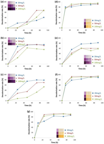 Time course for the azo dye decolorization rates of various pure cultures and consortia of bacteria and yeasts. (a) B-1, (b) B-2, (c) B-C, (d) Y-1, (e) Y-2, (f) Y-C, and (g) T-C. The four color boxes show the sample’s color difference over four days. The legend (mg/L) represents different concentrations of the AB113 added.
