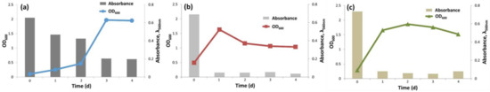 The cell population density (OD600) and its concomitant decolorization activity at 560 nm over time were comparatively analyzed. At the beginning (days 1 and 2), the growth of the B-C was much slower than that of the yeast. In the overall consortia, there was a strong negative correlation between OD600 and the λ560nm because absorbance at 560 nm decreased as the OD600 increased. The B-C had a longer lag phase (2 days), while the Y-C seemed to have a shorter lag period (Figure 2a,b). B-C reached its plateau growth after 3 days, while it took only a day for Y-C to reach its plateau.