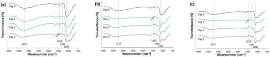 Time course for the FT-IR profiles of the three microbial consortia during biodegradation of the azo dye Acid Blue 113. (a) B-C, (b) Y-C, and (c) T-C.