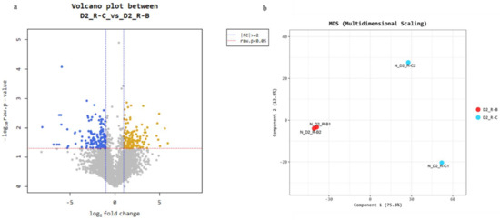 After the read mapping, the DEG analysis was performed on a comparison pair D2_R-C (control) vs. D2_R-B (treatment) using RPKM. Two replicates for each sample were analyzed to find its significance. The result showed 272 significant genes were selected on the conditions of |fc| ≥ 2 and the independent t-test raw p-value < 0.05. Among the significantly different 272 DEGs, 131 DEGs were up-regulated and 141 DEGs were down-regulated. In other words, 131 DEGs were expressed significantly higher in S. melonis B-2 exposed to Acid Blue 113 than that of normal conditions, while 141 DEGs were expressed less (Figure 4a). The identification of outlier samples or the similar expression patterns between the samples were analyzed using multidimensional scaling analysis (MDS). The scattering in component 1 was 75% and shows a higher correlation in the normalized D2_R-B1 and D2_R-B2 as shown in Figure 4b.