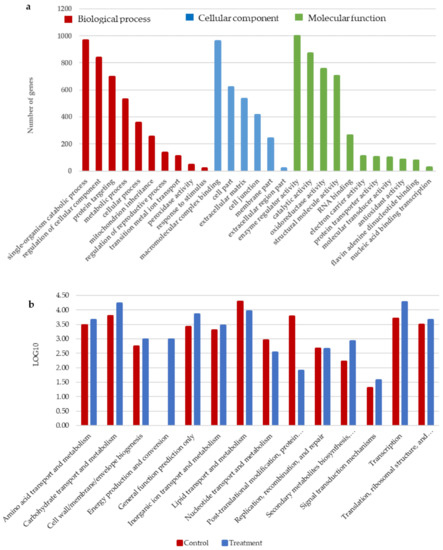 Annotated UniGenes were mapped to the annotations of corresponding orthologous groups in the EggNOG database to identify enzymes distributed in orthologous groups and non-supervised orthologous groups. (Figure 5b). The RPKM value for the two pairs of the control and the treatment were normalized through LOG10 and their mean was calculated. For EggNOG annotation, 272 significant genes were divided into 14 EggNOG categories. Some of the UniGenes were assigned to more than one category. The largest proportion of UniGenes belonged to “Carbohydrate transport and metabolism”, with a log10 value of 4.22 in the treatment, followed by “Lipid transport and metabolism” with 3.96 and “Amino acid transport and metabolism” and “Translation, ribosomal structure, and biogenesis” with values of 3.66 and 3.65, respectively. The “Energy production and conversion” was only present in the treatment with a Log10 value of 3.0. Most of the categories were dominant in the treatment process, while “Lipid transport and metabolism”, “Nucleotide transport and metabolism” and “Post-translational modification, protein turnover, and chaperones” were dominant in the control.