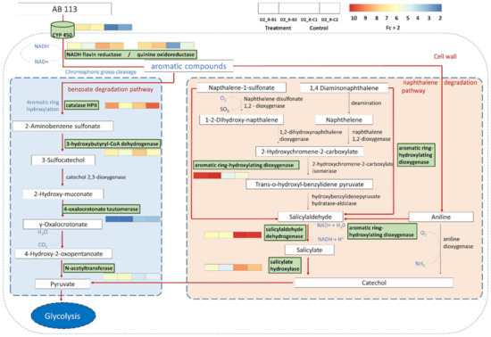 Enzymes involved in the pathways of azo bonds and aromatic compounds were identified by transcriptome analysis. The degradation of AB113 was generally performed through the benzoate and naphthalene degradation pathways. As shown in Figure 6, the metabolism of azo dyes mainly undergoes a two-step reaction. The key enzyme to catalyze the reaction is the CYP450 enzyme system initiating the heme-linking process. The heme-linking reaction was performed by three CYP450 genes, all of which were downregulated. NADH flavin reductase, quinine oxidoreductase and catalase HPII are the azo bond-degrading enzymes replacing the azo reductase. The azo bond-degrading enzyme contained six upregulated genes and one downregulated gene. The degradation of the azo bond allows 2-aminobenzene sulfonate to be degraded through the benzoate degradation pathway and naphthalene-1-sulfonate, 1,4 diaminonaphthalene and aniline to be degraded through the naphthalene degradation pathway and come under the aromatic degradation pathway. 3-hydroxybutyryl-CoA dehydrogenase, 4-oxalocrotonate tautomerase and N-acetyltransferase lead the degradation of benzene to the pyruvate and end in the glycolysis cycle.