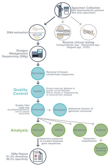 A metagenomics-based approach can provide sensitive and specific pathogen detection as well as the necessary strain typing information required for critical public health and food safety activities [4]. To date, clinical diagnostic laboratories have not embraced metagenomics for routine testing. The expense, turn-around time, and analytical expertise required have been cited as barriers to routine use [5,6]. However, ongoing technological advancements in nucleic acid sequencing [7,8] and bioinformatics [9] are making metagenomics faster, less expensive, and more accessible. Proof-of-principle studies have highlighted the value of metagenomics for the clinical laboratory [7,8], including potential for pathogen detection in human stool specimens [10,11,12,13]. Stool metagenomes have been shown to support culture-independent strain typing [14,15,16] and single nucleotide polymorphism (SNP)-level differentiation of concurrent, epidemiologically unrelated, outbreaks [17]. Clusters of gastroenteritis caused by new or emerging viral pathogens have also been detected and investigated using metagenomics [18,19,20,21].