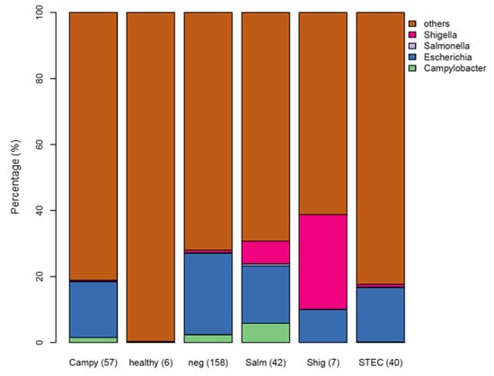 To assess differential abundance between gastroenteritis and healthy samples, taxa associated with disease state and pathogen type were tested using the Wilcoxon rank sum test at the species level on the filtered dataset (Supplemental Dataset S4). In this analysis, specimens from patients presenting gastroenteritis, irrespective of etiology, demonstrated a significantly higher abundance of E. coli and Klebsiella pneumoniae compared to healthy controls (BH-adjusted p = 0.0358 and 0.0267, respectively). The abundance of E. coli present in STEC infections was not significantly different compared to gastroenteritis caused by other bacterial pathogens (Figure 2 and Figure S2). This agrees with the previously observed increase in the abundance of E. coli during infections with Salmonella spp., norovirus, and other enteric pathogens [17,46,47]. In the healthy stool specimens analyzed, species, such as Hippea maritima, Acidithiobacillus caldus, and Phocaeicola vulgatus showed higher abundance levels in the healthy group (adjusted p = 0.0198). Of the three, Hippea and Acidithiobacillus are environmental microbes and may represent contaminants. Phacaeicola is not well known but is part of the bacteroidetes phylum, common to the gut microbiome. We further conducted the Kruskal–Wallis test to identify genera with significant differential abundance among culture groups and healthy. In order of significance, genera, including Klebsiella, Leadbetterella, Salmonella, Bacteroides, Cystobacter, Phocaeicola, Sulfurimonas, and Tannerella were significantly differentially abundant among cohorts (adjusted-p < 0.05) (Supplemental Dataset S4). All but Klebsiella were of higher abundance among the healthy samples.
