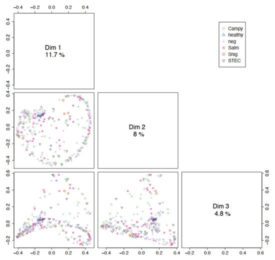 To explore the potential of community profiling for pathogen detection, we first assessed the similarity of metagenomes based on pathogen/disease state (culture result), patient, extraction kit, and sequencing platform variables. We performed PCoA using the Bray–Curtis dissimilarity distance measure among trimmed and normalized metagenomes, and conducted the PERMANOVA test on each variable for differences in centroid and dispersion among groups (Figure 3 and Figure S1). If metagenomes containing the same pathogen group together, and distinct, from metagenomes containing other pathogens, then community profile could be explored as a potential pathogen detection tool. While visual observation of PCoA plots shows clustering of healthy stool metagenomes, but not diseased, all variables were significant with adjusted p-values ≤ 0.003, and post-hoc analyses showed pair-wise comparisons between groups within each variable (Supplemental Dataset S3). While visually scattered on the PCoA plot, centroids measured for each pathogen differed significantly (p = 0.001), and significant differences were highlighted by comparisons of diseased to healthy samples. The centroids representing different sequencing platforms as well as DNA extraction protocols employed in this project were also significantly different (p = 0.002, 0.001), indicating that standardized collection, storage, extraction methodologies, and sequencing platform would need to be in place to optimize pathogen detection based on microbiome analysis. While the difference between metagenomes containing distinct pathogens was statistically significant, the distinction would not be sufficient to categorize metagenomes into pathogen types. As a result, our initial microbial profiling results do not support the use of community profiling for pathogen detection and thus we did not explore this further.