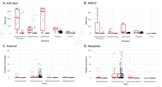 Pathogen detection tools compared: (A) KAT-SECT; (B) SRST2; (C) Kraken2; (D) Metaphlan. Culture-positive (red), culture-negative (black). x-axis displays the curated database chosen for each pathogen for KAT-SECT and SRST2 and the taxon for Metaphlan and Kraken2. Y-values plotted for KAT-SECT and SRST2 are the sum of the identified alleles from reference databases. An “allele hit” was defined by default settings in SRST2 and when k-mer coverage was greater than 10% in KAT-SECT. Values plotted for Kraken2 and MetaPhlAn are the percentage of fragments covered by the clade rooted at this taxon and the relative abundances of reads classified to species, respectively.