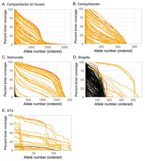 KAT-SECT identified alleles from curated databases for each pathogen of interest: (A) in-house campylobacter database; (B) Campylobacter VFDB database; (C) Salmonella VFDB database; (D) Shigella VFDB database; (E) STX in-house database. Whole genome sequences from pure culture isolates (red), and metagenomes from bacterial culture-positive (orange) and culture-negative (black) stool specimens. x-axis, the k-mer coverage against each allele in the database, sorted in descending order (allele rank number on x-axis). y-axis, percent of allele bases with at least 1-times kmer coverage.