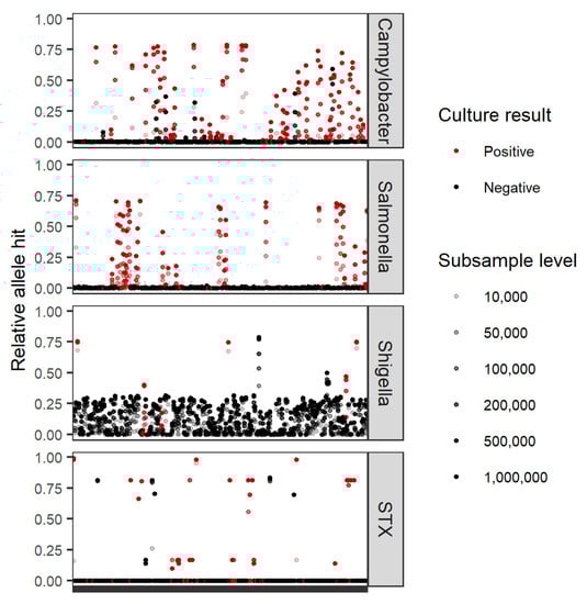 Relative allele hits of Campylobacter in house, STX, Salmonella., and Shigella databases in subsampled read sets to assess the limit of pathogen detection. Specimen read sets are plotted in alphabetical order on the x-axis. Relative allele hits are based on KAT-SECT analysis and calculated as total number of alleles that had greater than 1% (0.5% for Campylobacter) k-mer coverage divided by the total number of allele sequences in the database queried (y-axis).