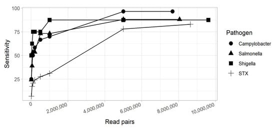 In this study, we observed 10 culture-positive samples where increasing the sequencing depth to an entire MiSeq run (13.2–15 Gb) did not yield evidence of the pathogen. Thus, we asked if there are limits to increasing the sequencing depth with a corresponding increase in sensitivity as compared against culture. In other words, is there a point at which more sequencing is not going to increase sensitivity? We found that the sensitivity of metagenomics increases steadily until 1–5 million read pairs, after which increasing the sequencing effort has a smaller impact on improved sensitivity (Figure 7). Other studies have shown that increasing coverage beyond a threshold will decrease specificity, although we did not observe that effect [30].