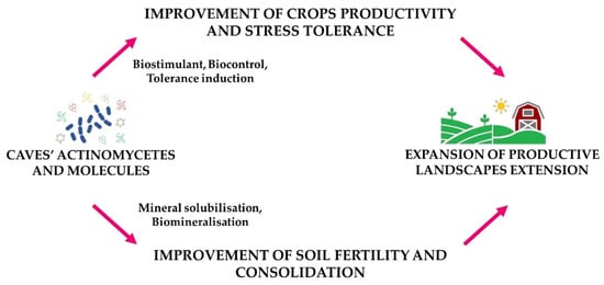 Climate change effects and anthropogenic activities associated with urbanisation and non-food crop cultivation are expected to limit the landscapes dedicated for food production. The major threats are represented by the spread of phytopathogens, excessive use of agrochemicals, and decreases in soil fertility. As presented in Figure 3, caves’ actinomycetes could be a useful tool to overcome these problems and extend productive landscapes by improving the productivity and stress tolerance of crops and improving soil fertility and consolidation. These activities are described in detail in the following sections.