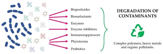 Actinomycetes play relevant ecological roles in environments, including the recycling of substances and degradation of pollutants. Actinobacteria can remove organic and inorganic pollutants (i.e., pesticides and heavy metals) [94]. Beyond bioactive molecules, actinomycetes produce enzyme inhibitors, immunosuppressors, phytotoxins, biopesticides, biosurfactants, probiotics, and enzymes involved in the degradation of complex polymers [95]. These capabilities are promoted by the oligotrophic properties of caves that stimulate inimitable strategies of the indigenous microbiome to remove pollutant compounds [24,96]. Augmentation, stimulation, cell immobilisation, and the production of biosurfactants were exploited during the last decades to enhance the capabilities of actinobacteria in bioremediation [97]. Figure 4 summarises the possible uses of actinomycetes from caves in the remediation of complex polymers, heavy metals, and organic pollutant-contaminated soils, which are described in the following paragraphs.