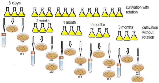 The cultivation was carried out at 28 °C on a rotary shaker at 180 rpm for three days, then the cultivation was continued at rest in a thermostat at 23 °C. In parallel, cultivation was performed without the use of a shaker; 15 flasks with LB medium inoculated with the culture were kept at rest in a thermostat at 23 °C. At different time intervals—3 days, 2 weeks, 1 month, 2 months, 3 months, and 6 months—cells were sequentially sampled from the flasks to measure culture growth parameters, as well as to analyze the enzymatic activity (Figure 1). Sampling from the flasks and all measurements were performed in three replicates.