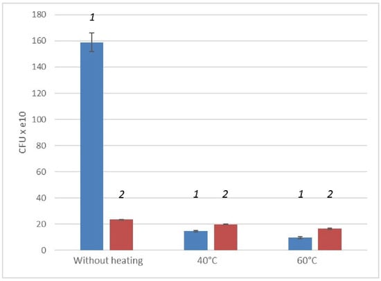 Heating at 40 °C resulted in a slight decrease in the number of surviving cells to 19.8 × 1010 mL−1. Heating to 60 °C also led to a decrease in the number of surviving cells; nevertheless, the CFU value was 16.4 × 1010 mL−1, which was almost two times higher than that for cells treated at this temperature after 3 days of cultivation. Based on the data obtained, it can be concluded that the culture grown in the LB medium shows less pronounced thermal sensitivity after 2 months of storage (Figure 2).