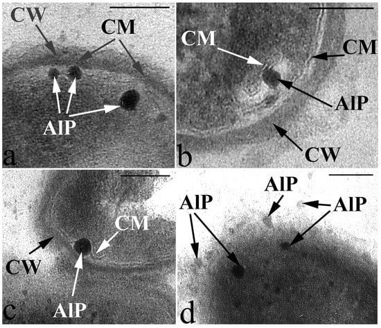 Peculiarities of acidocalcisome-like particles (AlP) localization as they are released from the cell into the environment in resting cells of G. polyisoprenivorans 135. (a) AlP in the cell cytoplasm on the inner surface of the cytoplasmic membrane (CM); (b) AlP inside the invagination of the CM on its outer surface; (c) AlP in the space between the cell wall (CW) and CM; (d) AlP in the extracellular space. Transmission electron microscopy (fragments of ultrathin sections). Designations: CM—cytoplasmic membrane; CW—cell wall; AlP—acidocalcisome-like particules. Bar—100 nm.