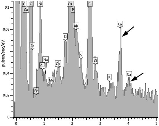 An X-ray spectrum of electron-dense acidocalcisome-like ultrastructures in cyst-like cells of G. polyisoprenivorans 135. Arrows indicate calcium peaks.