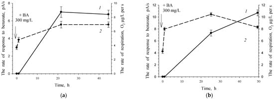 Under non-growth conditions, both an increase in cell respiration and an increase in BDO activity occurred in response to benzoate’s addition to the cell suspension (Figure 11a). Repeated addition of the substrate after a week of cell suspension storage resulted in a higher cell response for both indicators. To activate resting cells, the substrate, benzoate, was used at approximately the same concentrations as in the experiments for cell activation under non-growing conditions (250–300 mg/L).